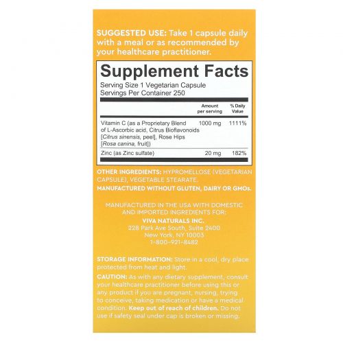 Описание товара Viva Naturals, Vitamin C + Zinc, 250 Veggie Capsules