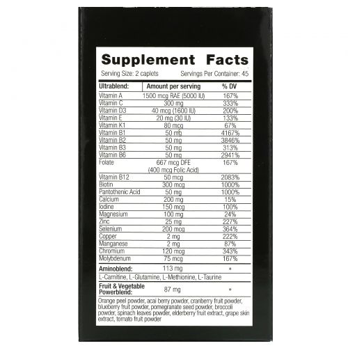 | Смесь овощей и фруктов Powerblend Порошок из цедры апельсина, порошок ягод асаи, порошок плодов клюквы, порошок плодов голубики, порошок из семян граната, порошок брокколи, порошок из листьев шпината, порошок плодов бузины, экстракт кожуры винограда, порошок плодов томатов | 87 мг | * |