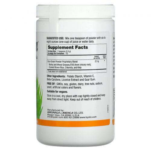 | Kyo-Green Powder Proprietary Blend Barley Grass and Wheat Grasses, FOS (from chicory root), cooked brown rice, chlorella, and kelp | 2.5 g | ** |