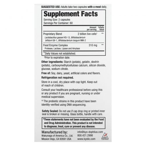 Описание товара Wakunaga - Kyolic, Kyo•Dophilus, пробиотики плюс ферменты, 120 капсул
