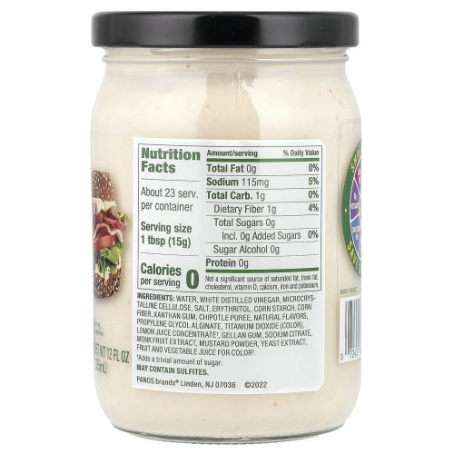 Вода, дистиллированный белый уксус, микрокристаллическая целлюлоза, соль, эритритол, кукурузный крахмал, кукурузная клетчатка, ксантановая камедь, пюре из чипотле, натуральные ароматизаторы, пропиленгликоль альгинат, диоксид титана (краситель), концентрат лимонного сока†, геллановая камедь, цитрат натрия, экстракт архата, горчичный порошок, экстракт дрожжей, фруктовый и овощной сок для цвета †.