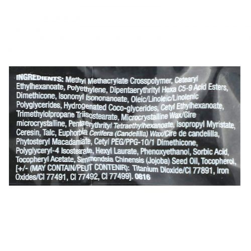 Другие ИнгредиентыМетилметакрилат кроссполимер, цетеариловый этилгексаноат, полиэтилен, дипентаэритрил гекса С5-9 кислотные эфиры, диметикон, изононилизононаноат, олеиновый/линолевый/линоленовый полиглицериды, гидрогенизированные кокоглицериды, цетеариловый этилгексаноат, триметилолпропан триизостеарат, микрокристаллический воск, пентаэритритил тетраэтилгексаноат, изопропилмиристат, церезин, тальк, канделильский воск (euphorbia cerifera), фитостерил макадамиат, цетил ПЭГ/ППГ-10/1 диметикон, полиглицерил-4 изостеарат, гексиллаурат, феноксиэтанол, сорбиновая кислота, токоферилацетат, масло жожоба (simmondsia chinensis), токоферол. Может содержать диоксид титана (CI 77891), оксиды железа (CI 77491, CI 77492, CI 77499).
