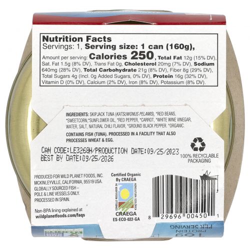 Skipjack tuna (katsuwonus pelamis) *red beans, *sweetcorn, *sunflower oil, *red pepper, *carrot, *white wine vinegar, salt, natural chili flavor, ground black pepper.