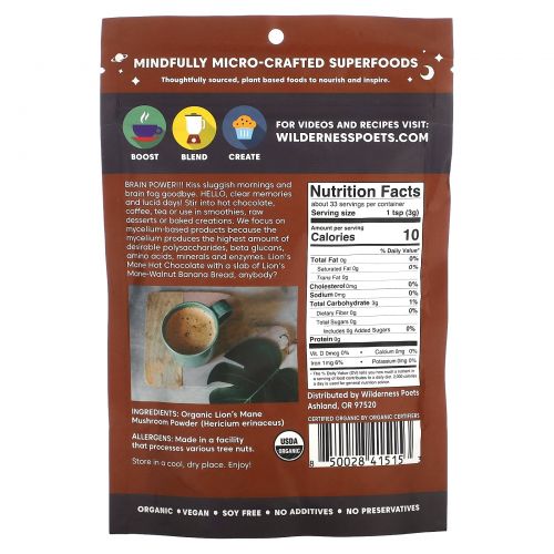 Описание товара Wilderness Poets LLC, органический ежовик гребенчатый в порошке, 99 г (3,5 унции)