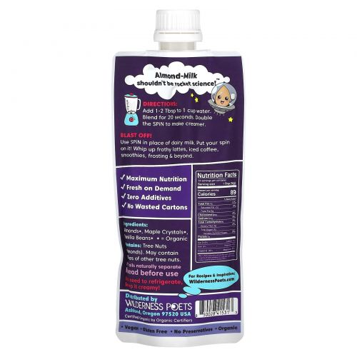 Описание товара Wilderness Poets LLC, Spin, органический концентрат миндального молока, ваниль, 227 г (8 унций)