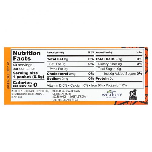 Описание товара Wisdom Natural, SweetLeaf, органический подсластитель из архата, в гранулах, 40 пакетиков по 0,8 г (0,28 унции)
