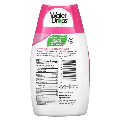 Описание товара Wisdom Natural, SweetLeaf, Water Drops, усилитель вкуса со стевией, малиновый лимонад, 1,62 ж. унц. (48 мл)