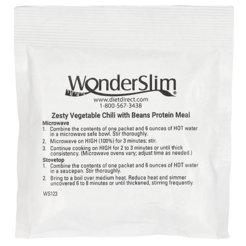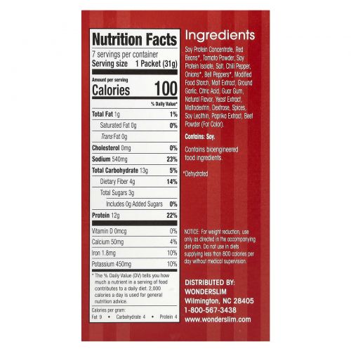 Описание товара WonderSlim, протеиновая мука, пикантный овощной чили с фасолью, 7 пакетиков по 31 г (1 унция)
