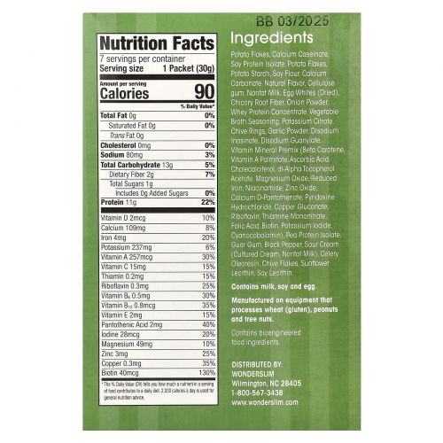 Описание товара WonderSlim, протеиновое картофельное пюре, сметана и зеленый лук, 7 пакетиков по 30 г