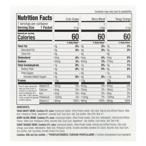 Напиток из ягод: Не содержит сока: Гидролизованный желатин, изолят сывороточного протеина, лимонная кислота, мальтодекстрин, натуральные и искусственные ароматизаторы, яблочная кислота, цитрат калия, аскорбиновая кислота, гуаровая камедь, аспартам*, соевый лецитин, аравийская камедь, соль, краситель красный 40.