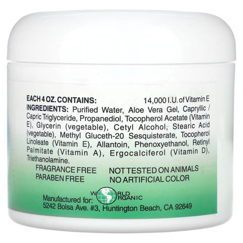 Описание товара World Organic, крем с витамином E и алоэ вера, без отдушки, 118 мл (4 унции)
