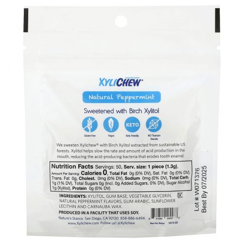 Описание товара XyliDENT, ксилитоловая камедь без сахара, натуральная перечная мята, 50 шт., 65 г (2,29 унции)