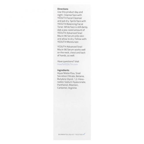 Описание товара YEOUTH, Advanced Snail Mucin 96 Serum, 100 мл (3,4 жидк. Унции)