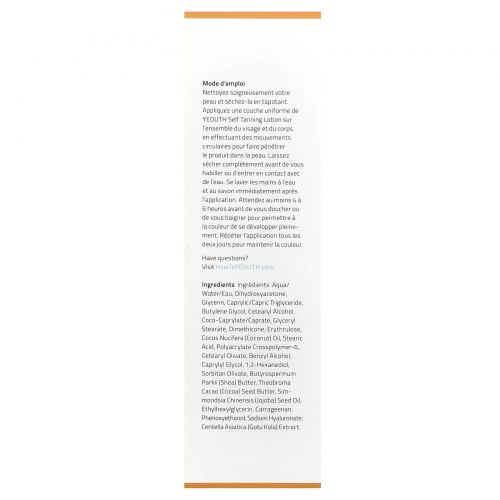 Тщательно очистите кожу и промокните кожу насухо. Нанесите ровный слой лосьона-автозагара от Yeouth® на все лицо и тело круговыми движениями, чтобы он слился с кожей. Дайте полностью высохнуть перед тем, как надевать одежду или контактировать с водой. Вымойте руки с мылом сразу после нанесения. Подождите не менее 4–6 часов перед душем или плаванием, чтобы цвет полностью проявился. Повторяйте нанесение каждые несколько дней для сохранения цвета.