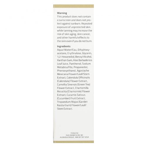 Другие ИнгредиентыВода (Aqua/eau), дигидроксиацетон, эритрулоза, глицерин, 1,2-гександиол, бензиловый спирт, ксантановая камедь, сок из листьев алоэ вера (Aloe barbadensis), пантенол, метабисульфит натрия, пропандиол, феноксиэтанол, экстракт цветков, листьев и стеблей агастахе мексиканского (Agastche mexicana), экстракт цветков календулы (Calendula officinalis), экстракт цветков зеленого чая (Camellia sinensis), экстракт цветков ромашки (Chamomilla recutita), экстракт плодов огурца (Cucumis sativus), экстракт цветков, листьев и стеблей настурции садовой.