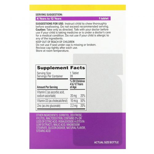 Описание товара Zarbee's, Ежедневная поддержка иммунитета для детей, для детей от 4 лет, натуральные тропические фрукты, 28 жевательных таблеток