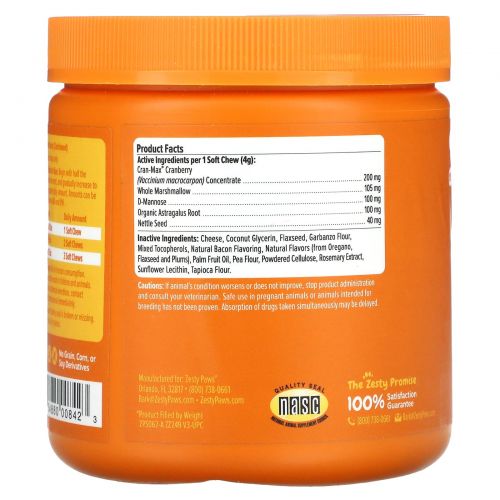 Описание товара Zesty Paws, Cranberry Bladder Bites, добавка для собак с ароматизатором «Бекон», 90 мягких жевательных таблеток