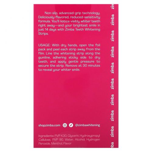 Улучшенная технология предотвращения скольжения. Формула с восхитительным вкусом, снижающая чувствительность. Вы сразу заметите заметно более белые зубы и самую сияющую улыбку всего за 14 дней благодаря полоскам для отбеливания зубов Zimba.