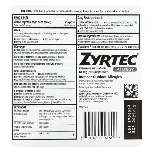 Описание товара Zyrtec, Allergy, цетиризин гидрохлорид, 10 мг, 60 таблеток