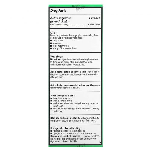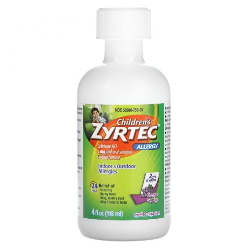 Описание товара Zyrtec, Children's Allergy, Relief Syrup, для детей от 2 лет, со вкусом винограда, 5 мг, 118 мл (4 жидк. Унции)