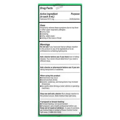 Описание товара Zyrtec, Children's Allergy, Relief Syrup, для детей от 2 лет, жевательная резинка, 5 мг, 118 мл (4 жидк. Унции)