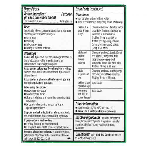 Описание товара Zyrtec, Children's Allergy, жевательные таблетки для детей от 2 лет, со вкусом винограда, 2,5 мг, 24 жевательные таблетки